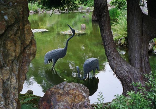 Bird Sculptures in Pond, Japanese Tea Garden at Golden Gate Park, San Francisco.