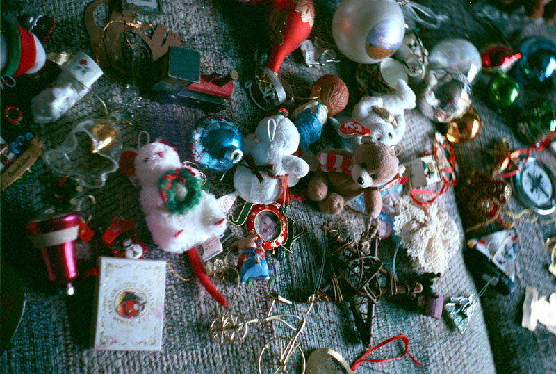 Christmas tree ornaments have been removed from the tree and are in the
