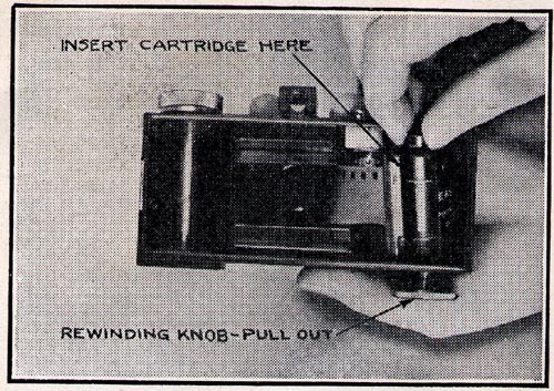 2. Pull rewind knob on bottom all the way out and insert film cartridge