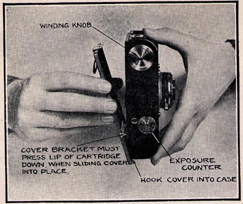 the rewind knob and engage sprockets in perforations so film lies flat and
