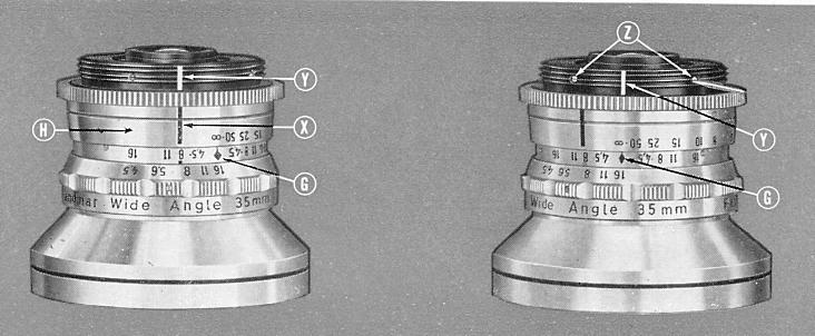 Using the small jeweler's screw driver, loosen four tiny screws (Z) two turns only. Then turn threaded ring either way until mark (Y) on threads is in line with the Red Focusing Scale Arrow (G) on lens. Tighten four screws. All four screws must be seated. Screw on Lens Cap to test if threads are clear.