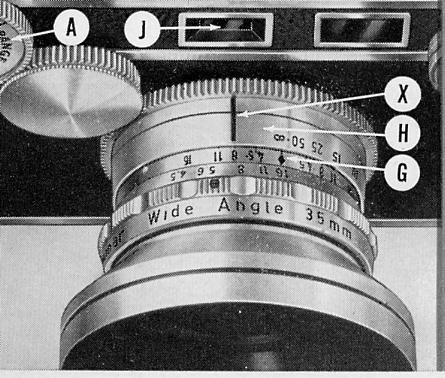 With lens mounted on the camera, rotate Rangefinder Dial (A) until Focusing Scale Arrow (G) is at infinity. Mark Lens Collar (H) with pencil mark (X) below Rangefinder Window (J). Remove Telephoto Lens in the same manner as you removed the Cintar Lens.